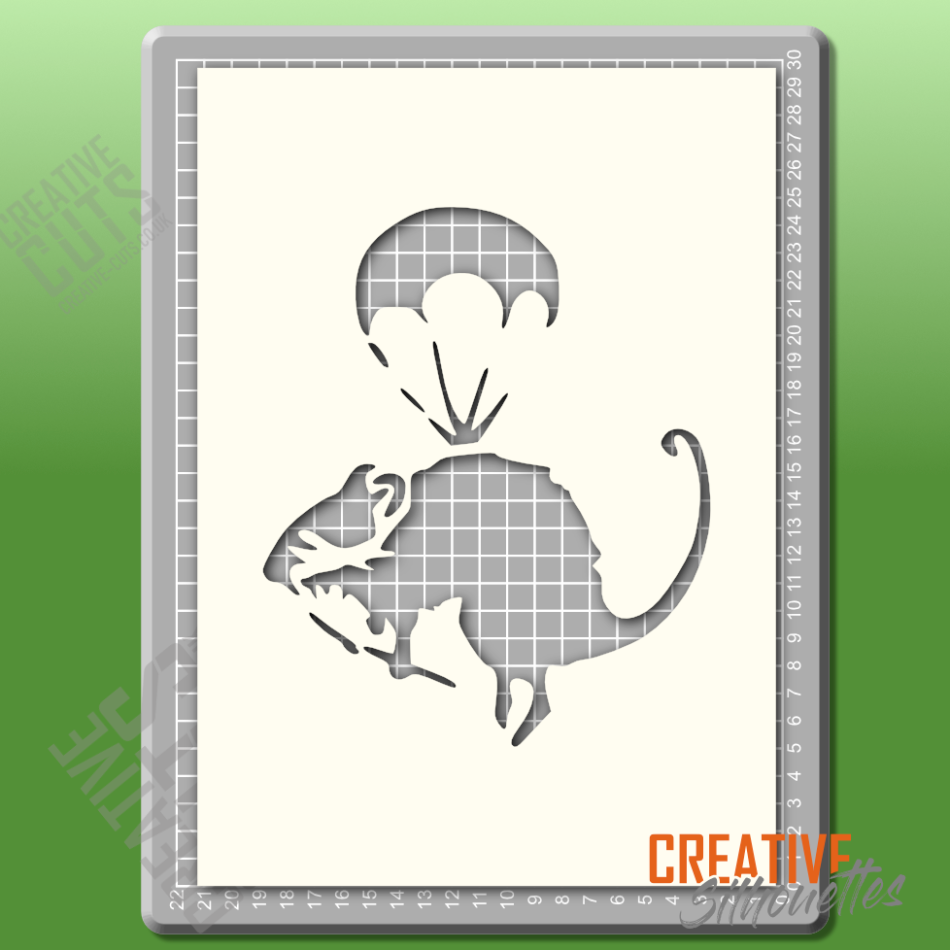 Banksy Parachute Rat StencilOverall design sizes are: A5: 110 x 135mm |